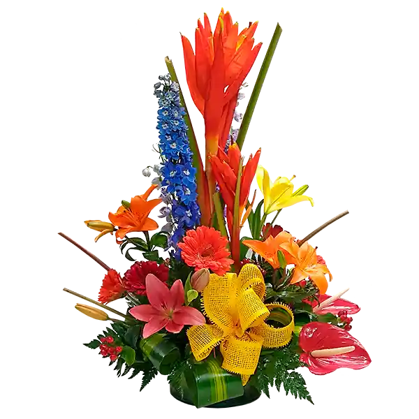 Arreglo en musas, delfinios, gerberas, lazo, anturios, lirios naranjas y amarillos.