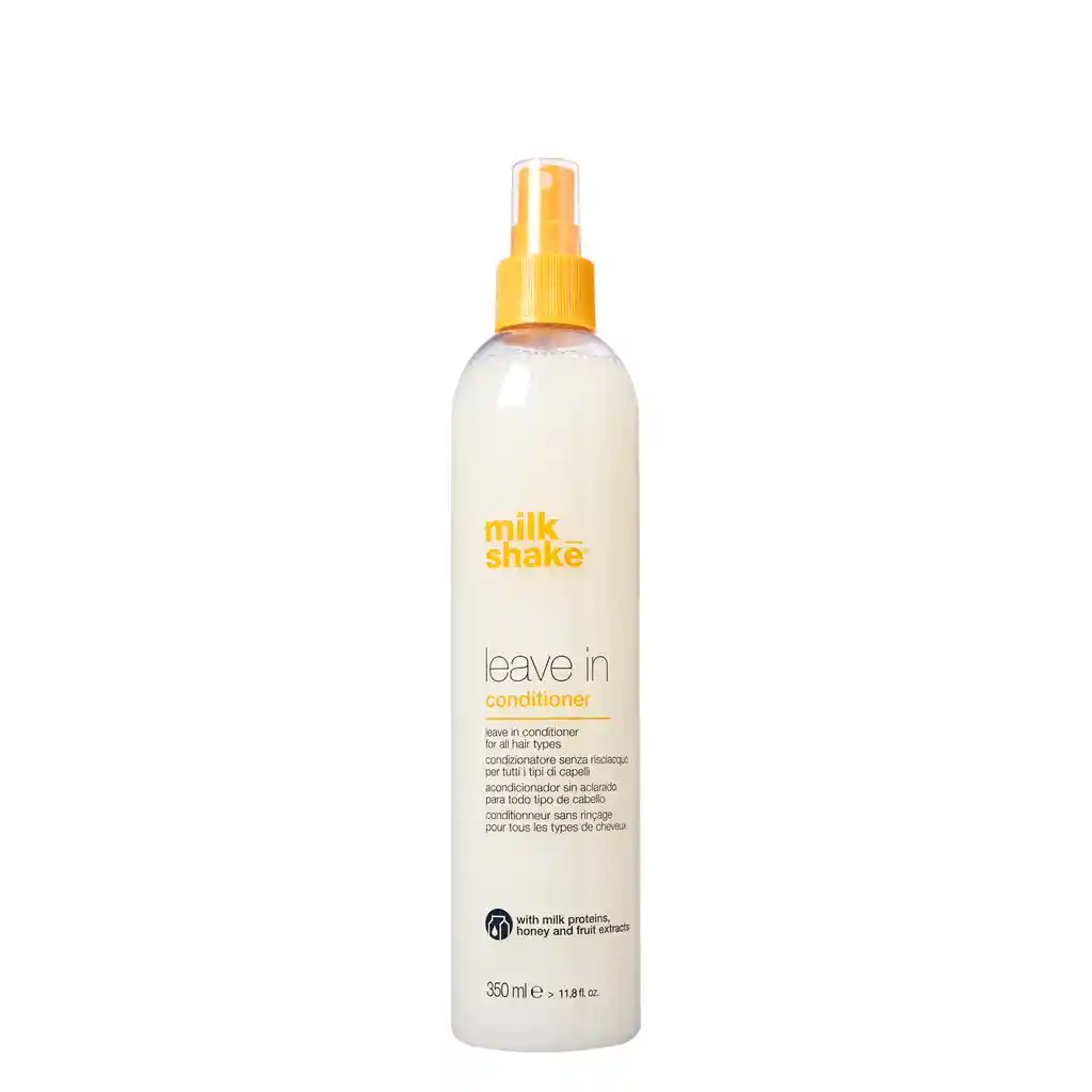 Milk Shake Leave In Conditioner 350ml. El acondicionador en spray sin aclarado para cabello natural o ligeramente seco es un producto de cuidado capilar muy eficaz que proporciona manejabilidad al cabello dañado a la vez que protege la hebra capilar. Este acondicionador mejora el equilibrio de hidratación del cabello, y sus proteínas lácteas complementan y fortalecen el tallo capilar. Los extractos de frutas y la miel de este acondicionador revitaliza el cabello, dejándolo más brillante y manejable. El exclusivo ingrediente Integrity 41 protege el cabello de los rayos UV, mejorando la estabilidad del color. Este acondicionador en spray sin aclarado es perfecto para aquellas personas con cabello natural o ligeramente seco que desean mejorar la manejabilidad de su cabello. Las proteínas lácteas de este acondicionador ayudan a nutrir y fortalecer el cabello, mientras que los extractos de frutas y la miel aportan revitalización y brillo. El exclusivo ingrediente Integrity 41® ayuda a proteger el cabello de los rayos UV, garantizando que su color se mantenga vivo y bonito. Beneficios: Suavidad. Hidratación. Reparación y nutrición. Anti frizz y proteccion de color. Modo de uso: Agite bien. Aplica el acondicionador en spray por secciones sobre el cabello húmedo. Dejar actuar. Peinar como de costumbre.