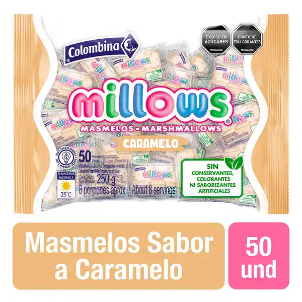 Masmelos Millows tipo snack sabor a caramelo en forma de cilindro, con los siguientes beneficios: Sin colorantes ni saborizantes artificiales, 0 grasas trans y sin conservantes.