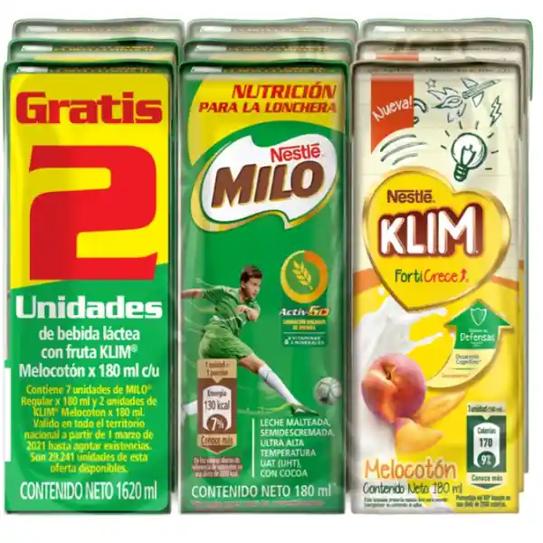 Milo Leche Malteada Activ-Go 7 Unidades de 180 mL c/u + Klim Bebida Láctea de Melocotón 2 Unidades de 180 mL c/u