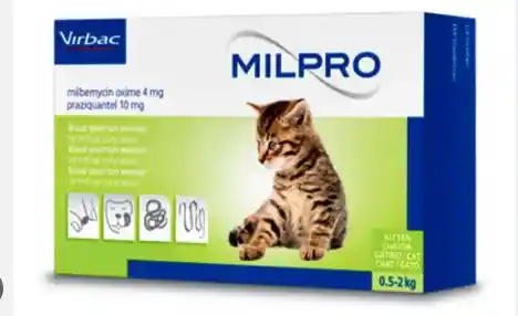 Milbemicina oxima (4 mg)/ Praziquantel (10 mg). Es un antiparasitario indicado en casos en que se requiera prevención contra el gusano del corazón y al mismo tiempo tratamiento contra taenias. Para gatos de 0.5 a 2 kg. Contiene 4 unidades.