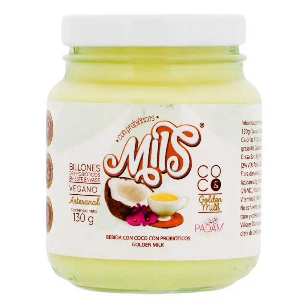 Yogurt Vegano Sabor Golden Milk Padam Marca Mils. Elaborado Con Ingredientes Naturales Con Más de 30 Millones de Probióticos Apto Para Veganos Sin Azúcar Añadida. Contiene 130 g