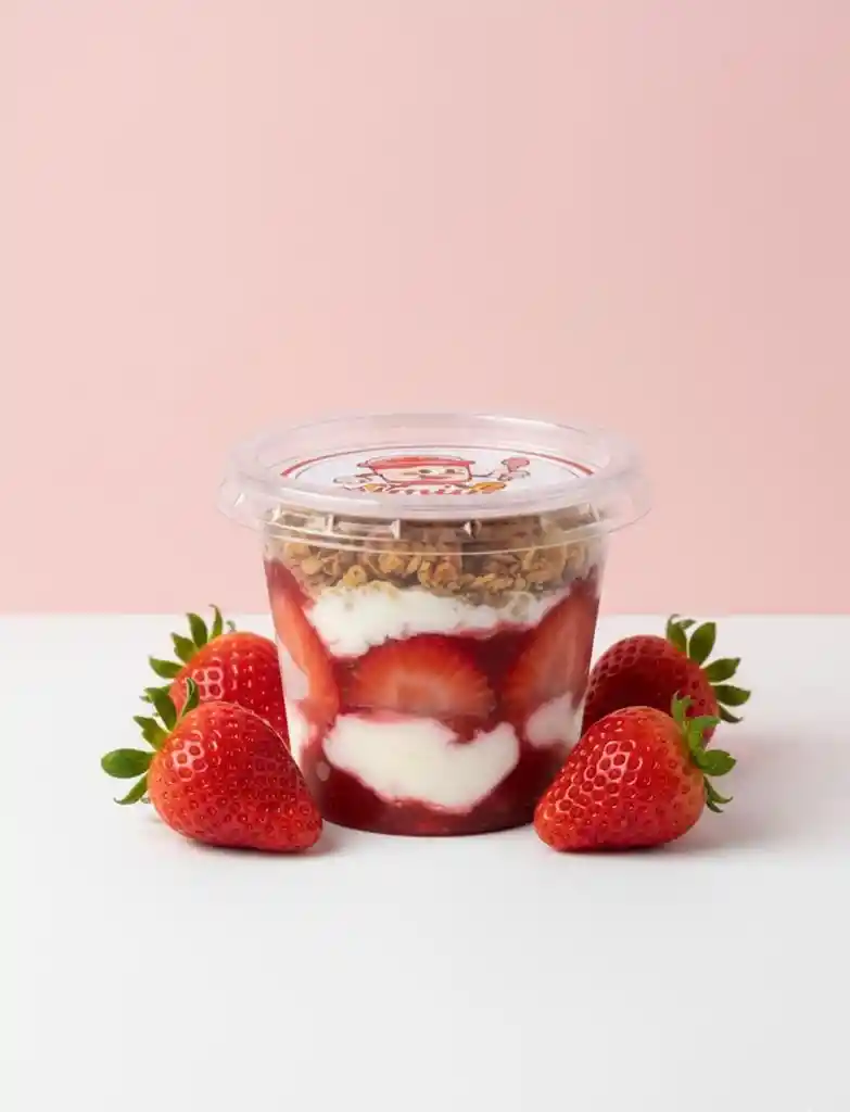 Yogurt Griego espeso artesanal, capas de mermelada de frutos rojos y granola.
