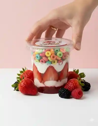 Yogurt Griego espeso artesanal, capas de mermelada de frutos rojos y cereal de froot loops de 4oz.