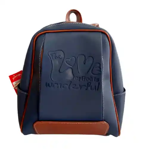 Mini Morral love of God is wonderful color azul, medidas 27 cm de ancho x 32 de alto y 12 cm de profundidad