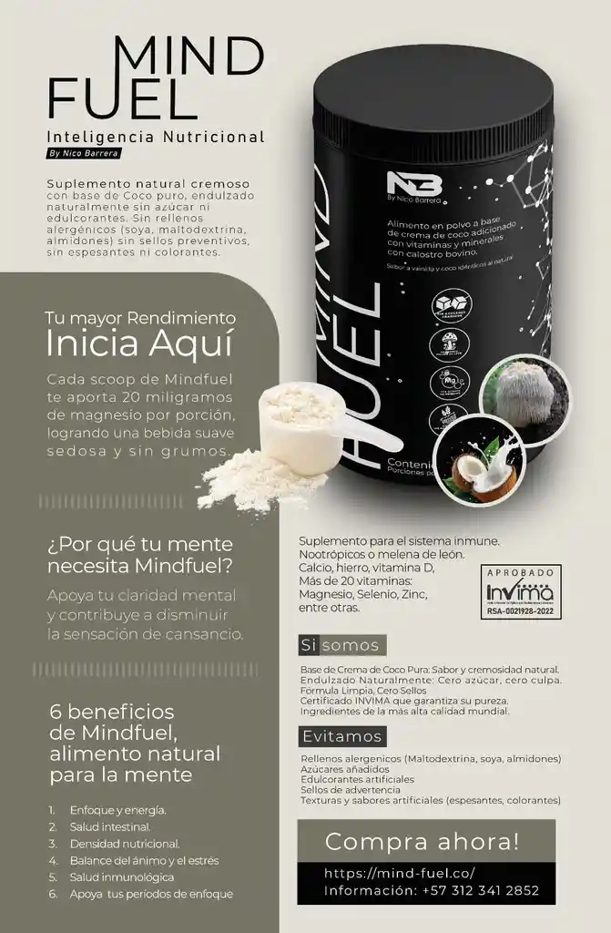 ========================== DEROCHA STORE =========================== === TECNOLOGÍA, JUGUETERÍA, HOGAR, FERRETERÍA, BELLEZA, ADULTOS=== MindFuel Suplemento Funciona como multivitamínico, tiene más de 15 vitaminas y minerales. DESCRIPCION MindFuel potenciador de rendimiento mental y cognitivo es un suplemento diseñado para optimizar el enfoque, la concentración y la claridad mental de forma natural y sostenida. Su fórmula avanzada combina Melena de león, un hongo adaptógeno científicamente estudiado por su capacidad para proteger y activar las neuronas, mejorando su comunicación hasta en un 10% por toma; citrato de magnesio, que favorece la concentración, el descanso nocturno y la recuperación muscular; y factor de transferencia (calostro bovino), que fortalece el sistema inmune para una mayor resistencia ante virus y enfermedades. Además, contiene más de 15 vitaminas y minerales esenciales, ofreciendo una nutrición completa para cuerpo y mente. No contiene azúcar, colorantes ni sabores artificiales, y su sabor natural a crema de coco y vainilla lo hace agradable y fácil de consumir. CARACTERISTICAS Potenciador mental y cognitivo Contiene Melena de león Incluye citrato de magnesio Con factor de transferencia (calostro bovino) Más de 15 vitaminas y minerales No genera picos ni bajones de energía Sin azúcar, colorantes ni sabores artificiales Sabor natural a crema de coco y vainilla Contribuye al descanso y claridad mental Refuerza el sistema inmune QUE INCLUYE LA COMPRA x1 suplemento