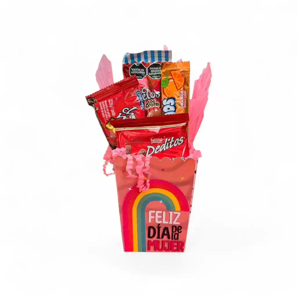 Mini ancheta en cajita de cartón decorada día de la mujer con variedad al azar de dulces