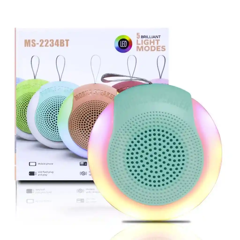 Altavoz RGB Bluetooth Portátil MS-2234BT Lista de funciones: 1.Encendido/Apagado 2.Puerto de carga USB Micro 3.Led de carga 4. Puerto USB/disco flash 5.LED cinco modos de luz 6.Siguiente canción/vol + 7.Canción anterior/Vol - 8.Reproducir/Pausar/Escanear 9.Modo de altavoz Diseño de apariencia de moda Batería de litio de alta capacidad Espectáculo de luces RGB de panel completo Con función de radio USB/FM. Con función Bluetooth Unidad de altavoz: 2" Potencia de salida: 5w Cable de carga micro USB de entrada El altavoz inalámbrico Tru y fácil de transportar