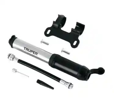 Cuerpo ligero de aluminio con diseño compacto Manguera reversible para válvula americana (Schrader) y europea (Presta) Compartimento para guardar manguera (incluida) Soporte para montarla al cuadro de la bicicleta Incluye válvulas para inflables y balones