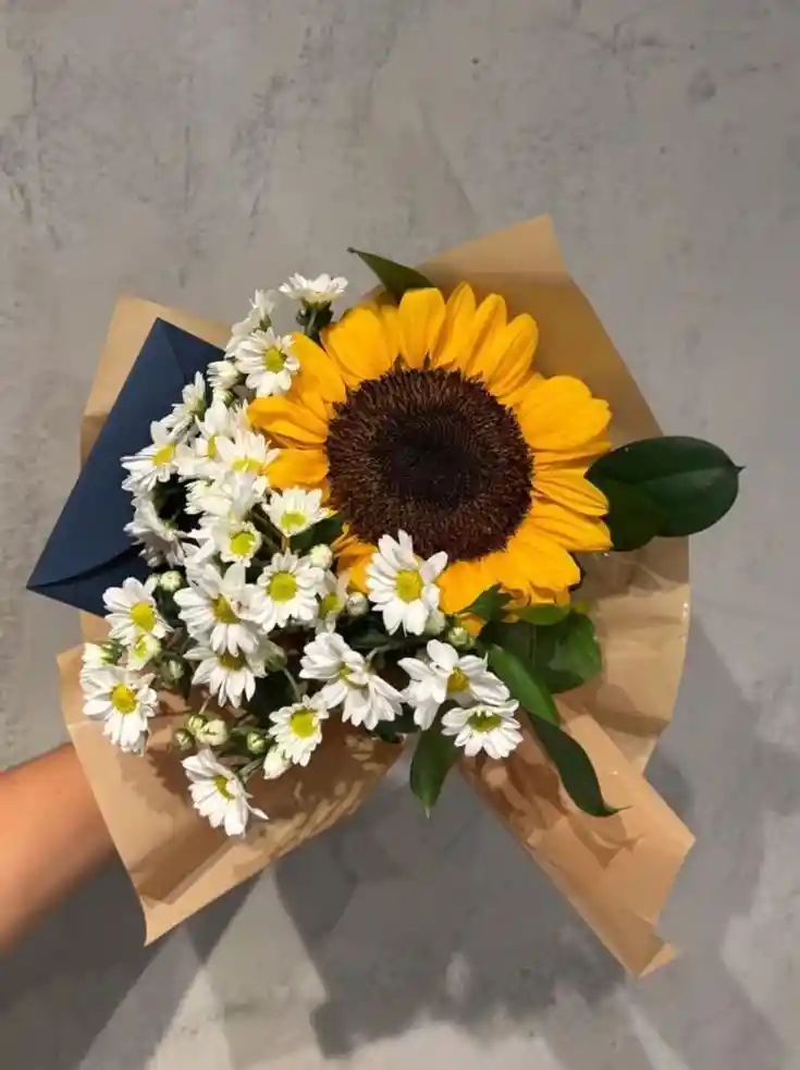 Mini bouquet de 1 girasol con margaritas. La flor puede ser sustituida dependiendo la disponibilidad de color y del producto “Mensaje Personalizado” máximo de 30 caracteres (Dejar el mensaje en el chat, los comentarios no se previsualizan para la tienda por lo que si se dejan allí no podrá ser incluido).