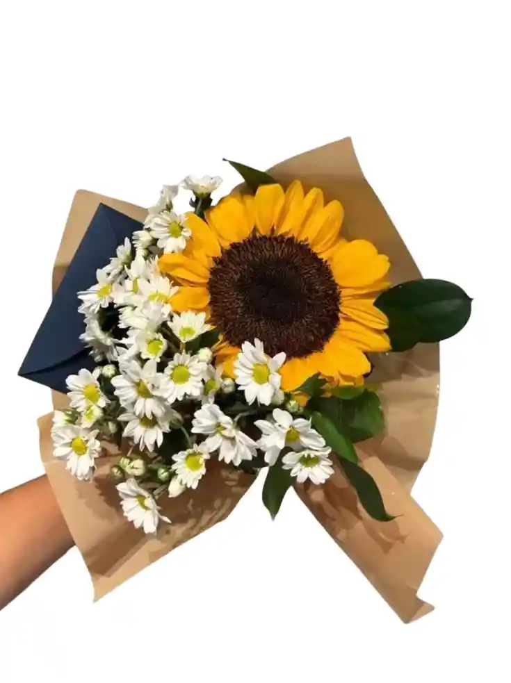 Mini bouquet de 1 girasol con margaritas. La flor puede ser sustituida dependiendo la disponibilidad de color y del producto “Mensaje Personalizado” máximo de 30 caracteres (Dejar el mensaje en el chat, los comentarios no se previsualizan para la tienda por lo que si se dejan allí no podrá ser incluido).