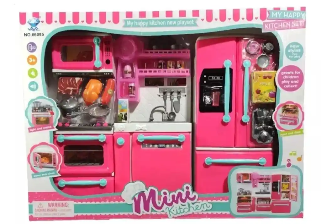 Juguete Juego Set de Cocina Grande Kitchen Set trae luz y sonido, Medidas de la caja: 46.5cms x 34.5cms x 10cms LA LUZ Y SONIDO SOLO VIENEN EN LA PARTE DE LA ESTUFA las parrillas y el horno encienden y suena como se cocina!!! El set incluye 1 horno de microondas 1 estufa con horno y 2 rejillas dentro del horno 1 fregadero con alacena sencilla en la parte de arriba y lavavajillas en la parte de abajo 1 canasta dentro del lavavajillas 1 refrigerador grande 1 pollo 1 chuleta 1 salchicha 2 ollitas 1 sarten Platos grandes Platos chicos Vasos 2 agrupaciones de hielo 1 volteador 1 pala 1 cucharon 1 bote de leche 2 botes de café 2 botes de jugo 1 botella de catsup 1 cajita de cereal 1 planilla de etiquetas 1 charola con artículos de te 2 tazas La luz y sonido funciona con 2 pilas AAA (No incluidas) quite el seguro para activar la función