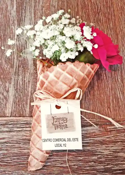 Mini cucurucho con clavel y follaje. El color de la flor es según disponibilidad en tienda. Medidas: 18 cms. x 12 cms.
