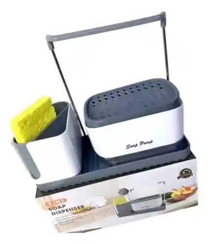 Dispensador de jabón: Cuenta con un compartimento para jabón líquido, con un mecanismo de dosificación manual. Soporte para esponja: Incluye un espacio integrado para almacenar y escurrir la esponja, manteniendo el área organizada y seca. Colgador para paños: Dispone de una barra o soporte para colgar paños de limpieza o estropajos, facilitando su secado y acceso. Material: Está fabricado en plástico resistente, lo que lo hace duradero y fácil de limpiar. Diseño: Presenta un diseño compacto y funcional que ayuda a optimizar el espacio en la encimera del fregadero.