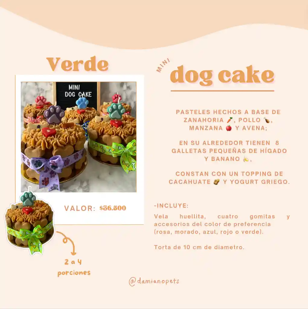 Pasteles hechos a base de zanahoria, pollo, manzana y avena; en su alrededor tienen 8 galletas de hígado y banano; constan con un topping de cacahuate y yogurt griego.