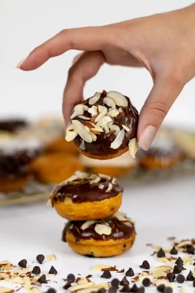 Vaso de 7 mini donas sabor tradicional con chips de chocolate, ganache de chocolate de leche y topping de almendras