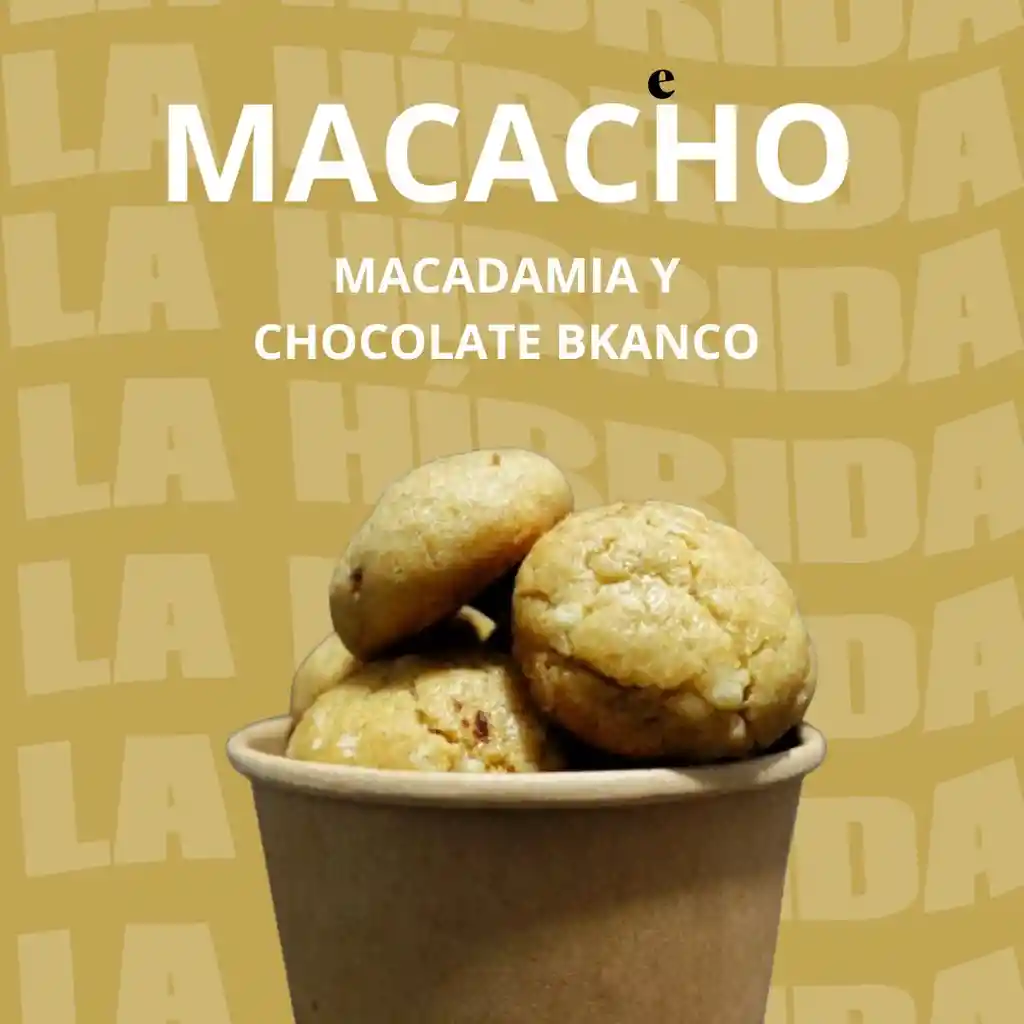 Galletas de macadamia y chocolate blanco. Vienen acompañadas de un recipiente de chocolate blanco para sumergir estas deliciosas mini galletas.