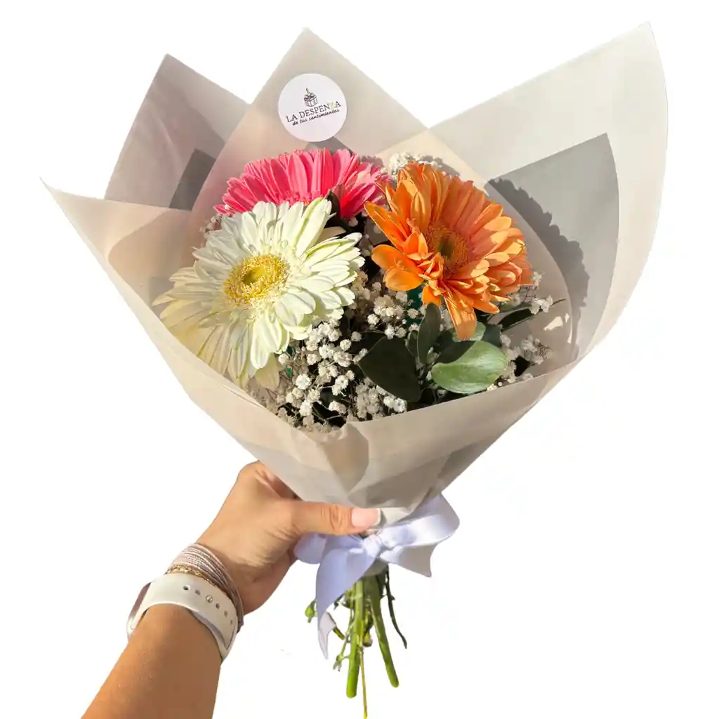 Ramo pequeño con gerberas surtidas, gypsofilia y follajes verdes. Envoltura en papel premium tono nude y moño satinado. Diseño fresco, minimalista y de alta durabilidad.