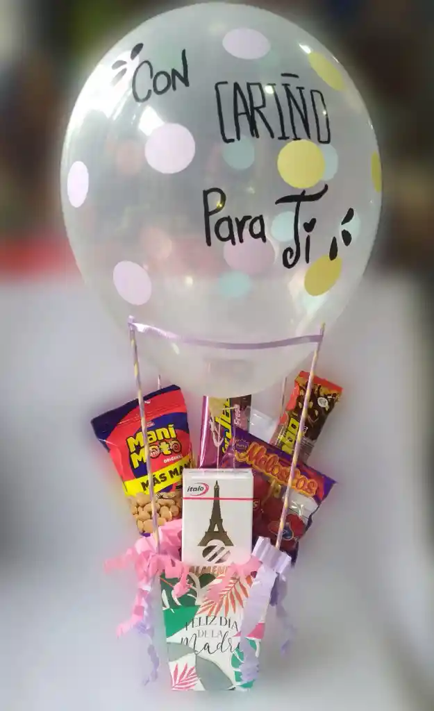 Mini globo aerostático día de la madre. Contenido: Chocolatina jumbo 40gr - Almendras Italo 50gr - Maní moto 48gr - Wafer jet 22gr - Moritas 40gr - globo R12 (Acorde a gama de colores de la caja) - Caja estampada día de la madre - Decoración diseño mini globo aerostático. Dimensiones aproximadas: 50cm Alto x 15cm Ancho.