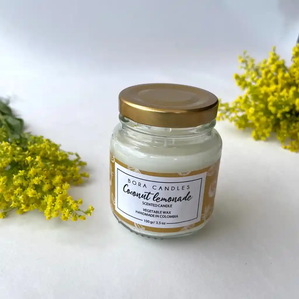Esta es una vela elaborada cuidadosamente por manos colombianas, la cual se caracteriza por presentar un aroma eléctrico pero muy acogedor que refleja el equilibrio entre el ambiente cálido de los trópicos y la armonía de la naturaleza. Coconut Lemonade es el complemento perfecto para tus espacios. **100gr/ 3,5oz. **Envase de vidrio re-utilizable. **Cera vegetal. ** Elaborada a mano. ** Tiempo de combustión: 20-22 horas aprox. ** Solo contiene la vela. Importante tener en cuenta las recomendaciones escritas en el producto.