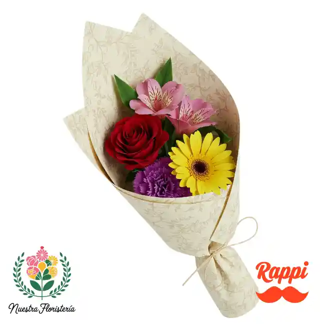 Un pequeño tesoro floral que celebra la diversidad en cada pétalo. Una rosa roja, un clavel morado, una margarita amarilla y una alstroemeria rosa se unen en un alegre y compacto bouquet.