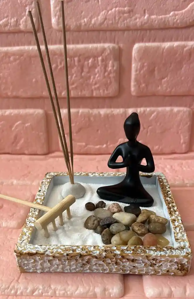 mini jardín Zen decorativo COD.1712 Base de 12x12 cm Buda poli resina 9x5x4cm Rastrillo Arena Porta incienso 3 velas incienso