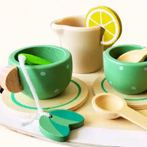 Juego de té de madera para juego de roles. Ideal para el aprendizaje temprano y el juego simbólico; incluye comida de juguete. Un juguete educativo perfecto para niños y niñas pequeños.