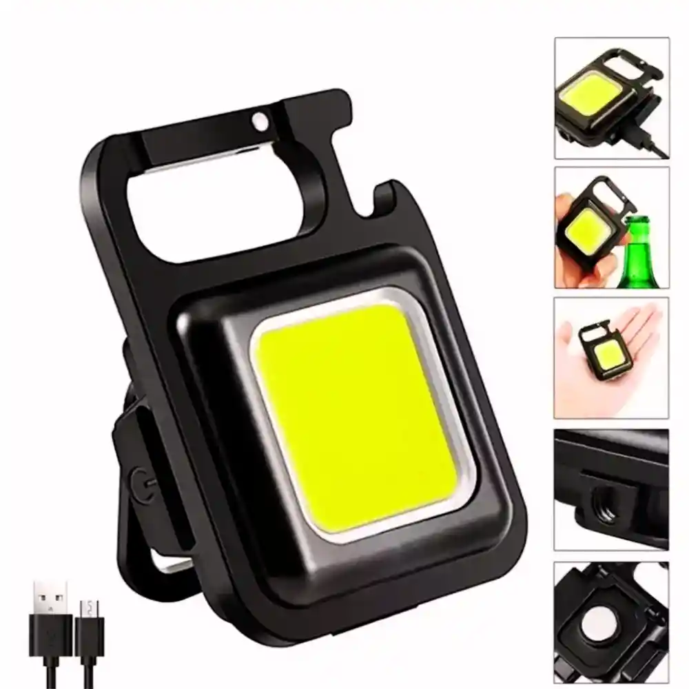 Mini Linterna Llavero Lampara Led Recargable Con Iman Camping No subestimes su tamaño compacto esta Mini Linterna Llavero Recargable es una verdadera bestia en iluminación y versatilidad. Diseñada para ser tu compañera de supervivencia urbana y aventuras al aire libre. Características: - Tecnología de Iluminación COB LED: A diferencia de los focos LED tradicionales que emiten un rayo estrecho, este panel cuadrado amarillo utiliza tecnología COB. Esto genera un haz de luz de inundación ultra gran angular y deslumbrante, capaz de iluminar tu zona de camping sin dejar puntos ciegos. - Mosquetón Integrado: Engánchala fácilmente a tus llaves, trabillas del pantalón, morrales de senderismo o collares de mascotas. ¡Siempre a la mano y sin estorbar! - Destapador de Botellas: Su robusto marco superior metálico está diseñado para destapar tus bebidas favoritas en segundos. - Base Magnética: Cuenta con un potente imán circular en la parte posterior. Pégala al capó del carro mientras revisas el motor, a la nevera o a cualquier superficie metálica para trabajar con manos libres. - Soporte Plegable Ajustable: Su soporte trasero articulado te permite apoyarla en el piso, una mesa o una roca, ajustando el ángulo de la luz exactamente hacia donde la necesitas (hasta 180 grados). - Entrada para Trípode (Rosca 1/4"): En la parte inferior tiene un orificio roscado estándar para fijarla a trípodes de fotografía o aros de luz. - Batería Recargable: Cuenta con una batería de polímero de litio integrada de alto rendimiento. Se recarga fácilmente mediante el cable USB incluido. Especificaciones: - Fuente de Luz: Panel COB de alta luminosidad. - Materiales: Aleación de aluminio combinado con plástico ABS resistente. - Modos de Iluminación: Luz Alta (100%). Luz Media (60%). Luz Estroboscópica/Intermitente. Modo Súper Brillante (manteniendo presionado el botón). - Puerto de Carga: Puerto Tipo C (Incluye cable USB). - Resistencia: Construcción robusta, resistente a salpicaduras (NO es sumergible).