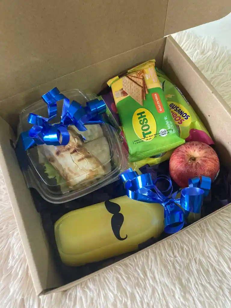Caja de cartón corrugado acompañado de un delicioso wraps de jamón, queso y vegetal. jugo néctar, manzana, Galleta tosh y gomitas.