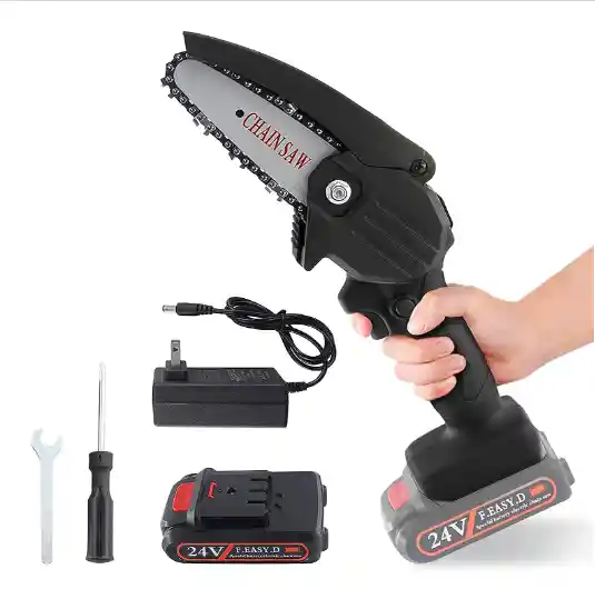 • Batería: 1500 mAh 5,55 Wh • Posee: cadena, espada de 4”, destornillador, lima y cargador. • Realiza cortes a madera liviana con diámetro inferior a 6 cm. • Se puede usar 5 min constante y se debe dejar descansar 15 min. • Colores: negro y rojo