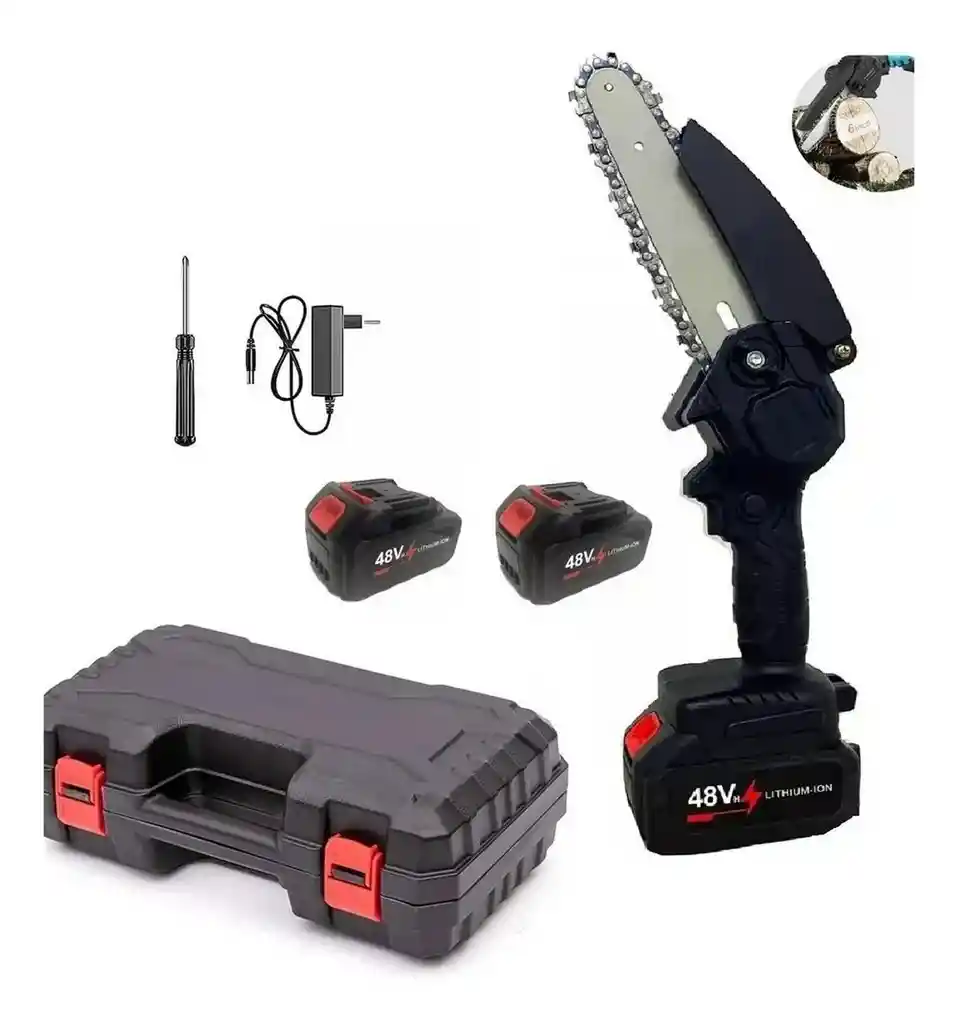 Potente, segura y fácil de usar, esta mini motosierra inalámbrica ofrece un rendimiento excepcional gracias a su motor de cobre puro de última tecnología, que garantiza mayor durabilidad y eficiencia en cada corte. Ideal para trabajos de jardinería, poda y corte de madera, esta mini motosierra destaca por su potencia, eficiencia y facilidad de uso, ya que permite cortar ramas de hasta 6 pulgadas en solo 8 segundos y realizar más de 90 cortes por carga. Incluye dos baterías de litio recargables de 48V y 2000mAh, con protección contra sobrecarga y temperatura para un rendimiento estable y seguro. Su diseño compacto y liviano, de apenas 2.5 libras, la hace fácil de manejar con una sola mano, siendo una herramienta práctica incluso para personas mayores. Contenido del paquete: 1 sierra 1 cadenas 2 baterías 1 cargador 1 destornillador. 1 Maleta de Transporte Ficha Técnica: Dimensiones: 40 cm x 18 cm Voltaje: 48 V Tipo: Mini Motosierra Eléctrica / Inalámbrica Voltaje: 48V (Potencia máxima para cortes eficientes) Diseño: Ergonómico y ligero para un manejo cómodo. Uso Ideal: Poda de ramas, corte de leña pequeña, trabajos de carpintería,y mantenimiento de jardines. ** _Para defectos de fábrica o retractos: \_Por favor revise el producto apenas lo reciba y antes de usarlo. No aplican ley de retracto o defectos de fábrica luego de usar el producto. Se manejan máximo 5 días para reportar defectos de fábrica (por ejemplo, producto funciona mal, piezas faltantes, rotas, etc). Para hacer efectiva la devolución el producto debe devolverse con el empaque original, el cual debe estar en buen estado, incluir todos los documentos y las partes completas y sin daño ( 1 mes de garantia )