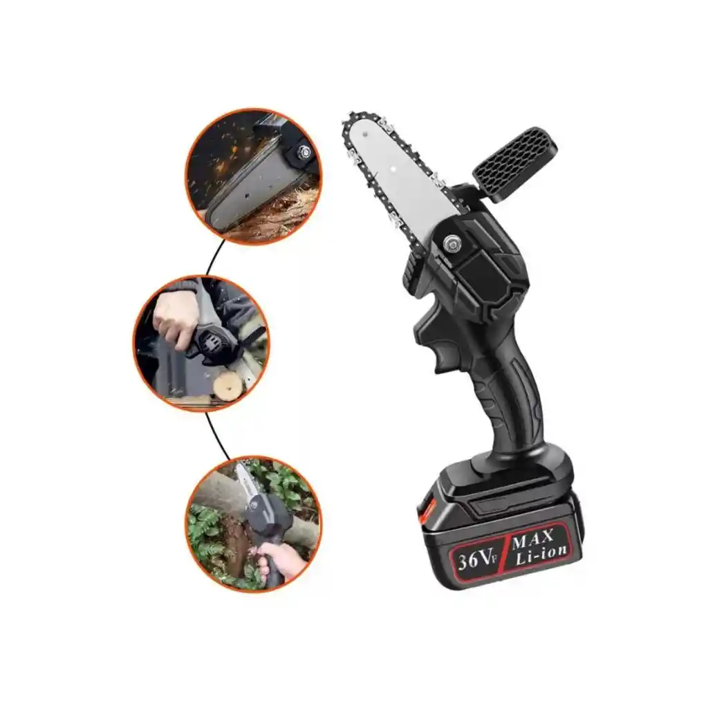 La mini motosierra eléctrica con 2 baterías es una herramienta compacta y versátil diseñada para realizar cortes precisos en madera, ramas y materiales similares con total comodidad. Su motor potente permite un funcionamiento eficiente y constante, mientras que las dos baterías recargables proporcionan mayor autonomía, permitiendo trabajar por más tiempo sin interrupciones y asegurando que siempre haya energía disponible. Su diseño ergonómico y liviano facilita el manejo y reduce la fatiga durante el uso prolongado, ofreciendo control y seguridad en cada corte. La cadena de acero de alta calidad garantiza cortes limpios y duraderos, mientras que el sistema de protección minimiza riesgos y sobrecalentamientos. Esta mini motosierra es ideal para jardinería, podas, bricolaje y trabajos domésticos, combinando potencia, practicidad y eficiencia en un solo equipo confiable.