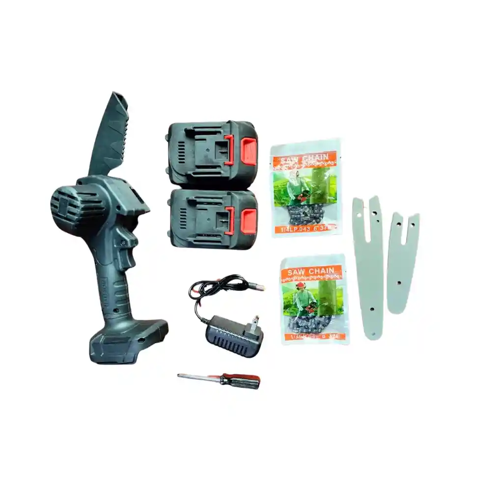 Mini Motosierra Eléctrica De Mano Portátil Ergonómico Recargable 48 v MAX Producto para El uso exclusivo DOMÉSTICO .Esta motosierra inalámbrica está especialmente diseñada con un ángulo ergonómico para facilitar el corte, también hay un mango antideslizante para un trabajo conveniente.Se utiliza un motor de cobre puro, que es muy potente. La eficiencia de corte es mayor y más rápida. Esta sierra eléctrica es muy adecuada para cortar madera, podar ramas de árboles, jardinería. El interruptor de la sierra de cadena puede ajustar la velocidad de acuerdo con la fuerza, y puede ajustar la velocidad de corte que necesita de acuerdo con las condiciones de operación. Aplicaciones MultifuncionalesLa sierra eléctrica podar es ampliamente utilizadas y pueden usarse para cortar ramas transversales de árboles frutales, leña doméstica, bambú, árboles jóvenes, enverdecimiento urbano, productos de madera para bricolaje, etc. Además, la motosierra eléctrica batería es más adecuado para uso doméstico, como poda de ramas altas y el jardín, lo que hace que su trabajo sea más eficienteEspecificaciones:Material: ABS, metalbatería: batería de 48V Incluye:1 Mini motosierra2 batería 2 cuchillas de 6" y 4"pulgadas 2 cadenas 1 destornillador 1 maleta o estuche para transportarla PRODUCTO IMPORTADO