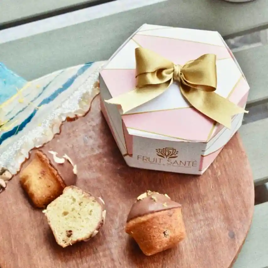 Este detalle incluye 4 Mini muffins con chips de chocolate, bañados en una capa de chocolate de leche y toques de almendras laminadas y pistachos triturados, empacados en una hermosa caja elegante, es ideal para tener un presente en cualquier momento,
