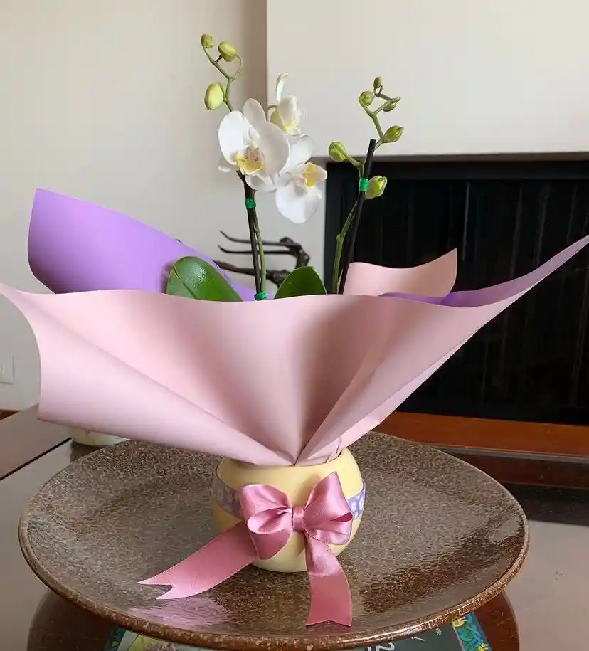 mini orquidea de 2 varas color blanca en matera, incluye tarjeta y moño