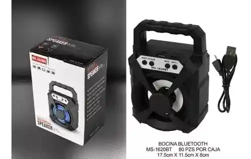 Caja de sonido con mango portable. Radio Fm, Tarjeta TF, USB, MP3. Puede conectar dos aparatos a la vez. Es recargable en USB.