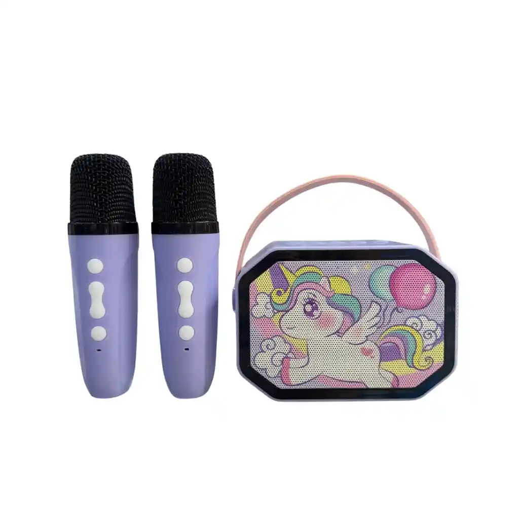 Unicorn Karaoke Mic Set: Este karaoke con 2 micrófonos está equipado con altavoces de alta calidad y chip DSP de reducción de ruido que reproduce perfectamente el sonido real sin ruido, permitiéndote disfrutar del sonido HiFi en casa. Las luces LED de colores cambian al ritmo de la música, creando una atmósfera alegre de KTV. Fácil de conectar:Esta máquina de karaoke está equipada con chip Bluetooth 5.3 integrado para una velocidad de conexión rápida y una transmisión estable. También es compatible con tarjeta TF, cable USB y conexión AUX. Puede conectarse fácilmente a una amplia variedad de dispositivos como teléfonos móviles, iPads, tabletas y ordenadores. Efectos interesantes de cambio de voz: El micrófono tiene 4 efectos increíbles de cambio de voz: voz infantil, voz masculina, voz femenina y voz de monstruo. Puedes divertirte más cantando y hablando con el micrófono. Además, también puede suprimir el sonido original, permitiéndote practicar tu canto siguiendo el acompañamiento musical. Ligero y portátil: Este set de karaoke pesa solo 540g. El equipo de música también viene con un mango de cuero que te permite llevarlo a cualquier sitio. Es ideal para salidas familiares, eventos al aire libre y todos los lugares para fiestas. ¡Cualquier lugar puede ser tu escenario! Regalo ideal para niños: El embalaje precioso y el diseño mono de unicornio serán el regalo perfecto para el cumpleaños infantil, Navidad o cualquier otra celebración. ¡Con este karaoke Bluetooth, disfruta de la música con tus hijos, familia y amigos