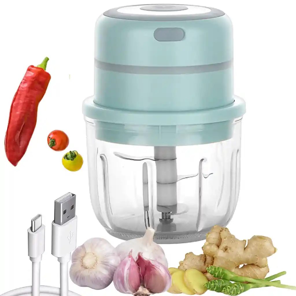 Picadora electrica de ajo y vegetales mini. Este procesador portatil cuenta con cuchillas de acero inoxidable de alta precision para triturar ingredientes como ajo, jengibre, chiles, cebolla, frutos secos y pequeñas porciones de carne de forma rapida y eficiente. Su funcionamiento es sencillo mediante un boton de pulso en la parte superior y se recarga a traves de un puerto USB, lo que elimina la necesidad de cables estorbosos durante su uso. El diseño es compacto, facil de lavar gracias a sus piezas desmontables y esta fabricado con materiales aptos para el contacto con alimentos. Es el accesorio ideal para optimizar tiempos de preparacion en la cocina y evitar olores persistentes en las manos. COLORES DISPONIBLES Blanco, Azul aguamarina, Rosado