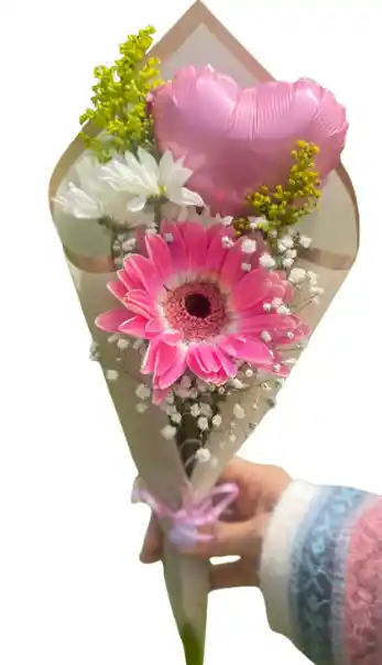 Flor Gerbera acompañada de un lindo mini globo corazón, flores margaritas y follaje en un elegante papel coreano. *color de la florecita a disponibilidad