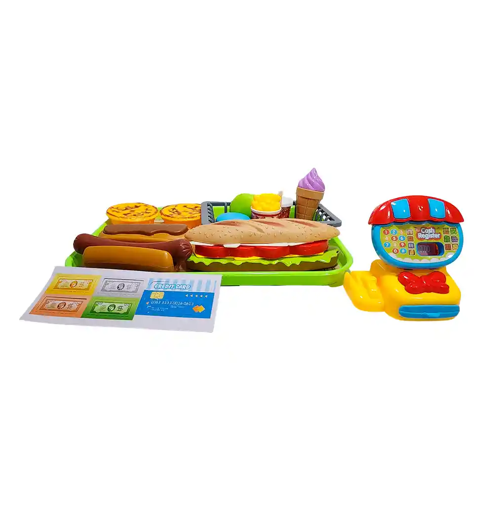 ¡Abre tu propio Mini Restaurante de Comida Rápida y conviértete en el chef y cajero estrella con este increíble set de juego! Este completísimo kit tiene todo lo que necesitas para servir los platillos más deliciosos, incluyendo una colorida caja registradora con dinero de juguete y tarjeta de crédito, una bandeja para servir, y una increíble variedad de comidas como sándwiches, perros calientes, papitas, helados y postres. Tu pequeño podrá tomar órdenes, calcular la cuenta y manejar el dinero, desarrollando su imaginación, habilidades sociales y conceptos matemáticos básicos de la manera más divertida posible. Desde hacer las compras con la canasta hasta servir un menú completo, este set es la receta perfecta para horas de juego creativo y sabrosa diversión. Ficha Técnica: Material: Plástico ABS Dimensión del empaque: 35 cm x 22 cm x 3 cm Edad recomendada + 3 Años Referencia: 623-208 Certificado de conformidad: CS-LCO-13233-2021S2/432 ** _Para defectos de fábrica o retractos: \_Por favor revise el producto apenas lo reciba y antes de usarlo. No aplican ley de retracto o defectos de fábrica luego de usar el producto. Se manejan máximo 5 días para reportar defectos de fábrica (por ejemplo, producto funciona mal, piezas faltantes, rotas, etc). Para hacer efectiva la devolución el producto debe devolverse con el empaque original, el cual debe estar en buen estado, incluir todos los documentos y las partes completas y sin daños.