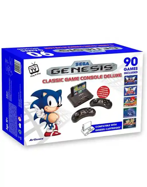 90 juegos integrados de 16 bits, incluyendo 40 juegos SEGA El paquete incluye un cartucho de bono precargado con 10 juegos de bonificación Dos controladores inalámbricos fáciles de usar Incluye cable AV Incluye adaptador de CA