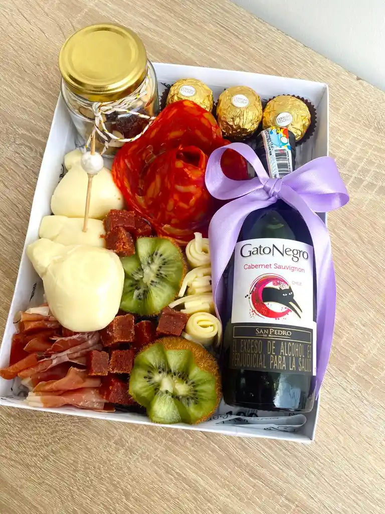 Vino de 187 ML ferrero x 3 frasco con mix de frutos secos Tabla de queso personal presentación caja de cartón con visor decorada vinilo de acuerdo a ocasion tarjeta con feliz dia