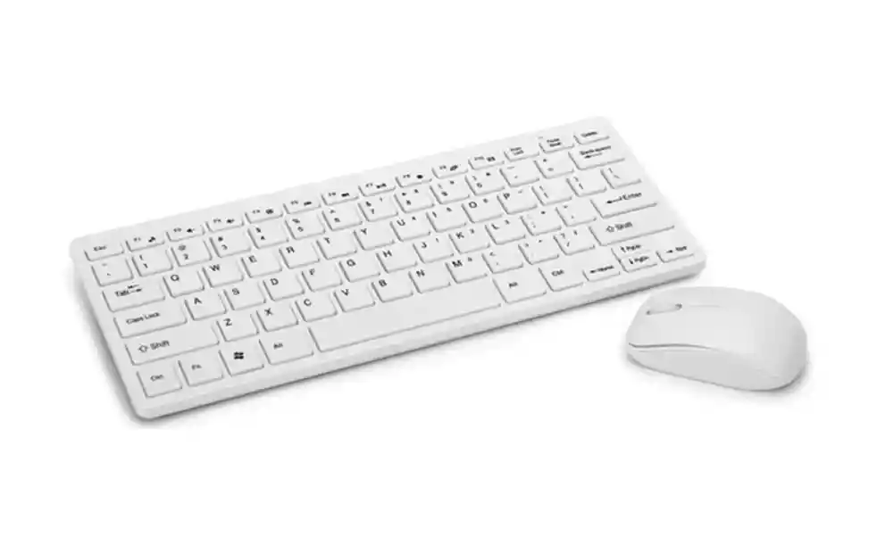 Mini combo teclado y mouse inalámbrico. Membrana que protege el teclado, funciona con pilas AAA, receptor USB para los 2 dispositivos Color: Blanco
