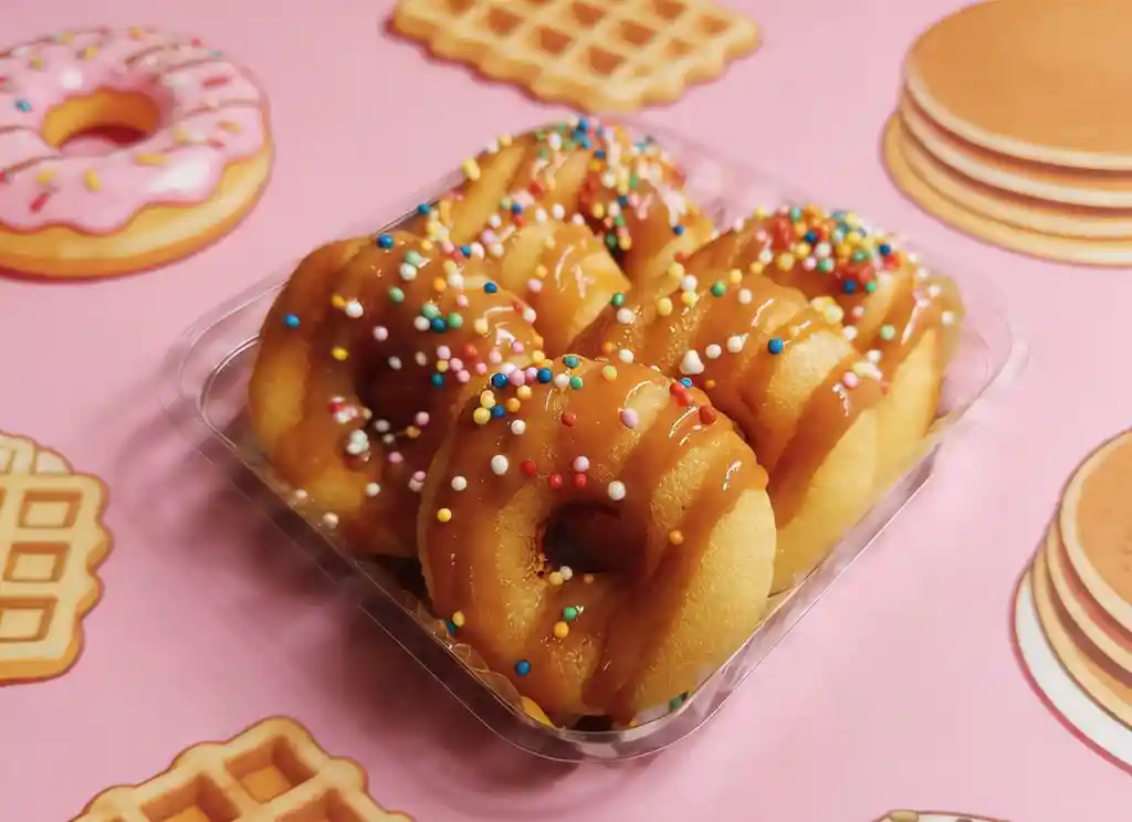 10 Minidonitas de vainilla preparadas con un sabor fantástico. ¡Personaliza tu antojito favorito paso a paso! Elige tu fruta, tu salsa y tu topping… y crea algo irresistible. 🍓🍫
