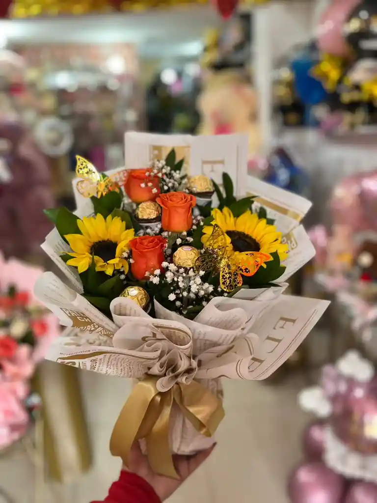 Arreglo floral sutil con base oasis forrado en papel coreano, lleva 3 rosas, chocolates Ferrero y girasol grande. *Color papel coreano según disponibilidad*