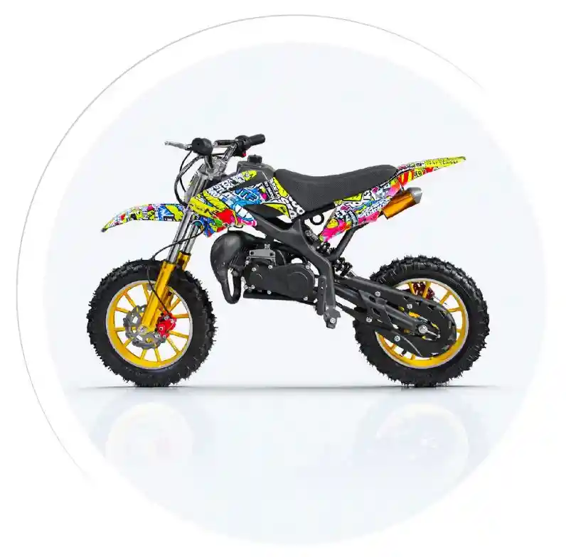 ¡Déjale la diversión a otro nivel! La Mini Motocross 50cc New Trek está diseñada para niños, adolescentes y principiantes que quieren vivir la adrenalina del motocross con seguridad, potencia y estilo. Su motor de 50cc a gasolina, su diseño deportivo lleno de gráficos estilo stickerbomb y su manejo suave la convierten en la mini moto perfecta para iniciarse en el mundo off-road. Esta motocicleta combina velocidad, control y resistencia, ideal para pistas, terrenos irregulares, fincas, senderos y diversión al aire libre. Si buscas una moto para niños resistente, rápida y segura: ¡esta es la mejor opción del mercado! BENEFICIOS DESTACADOS 1.Motor 50CC: potencia real y emocionante Ideal para quienes empiezan en motocross, permite alcanzar velocidades de hasta 30 km/h con excelente respuesta. 2.Llantas Off Road rin 10 Fabricadas en aleación 7117 para máxima resistencia y agarre en cualquier terreno. 3.Perfecta para jóvenes pilotos Apta para niños desde 6 años en adelante y soporta hasta 60 kg, permitiendo uso prolongado sin perder estabilidad. 4.Automática: solo acelerar y disfrutar Sin cambios complicados. Facilita un aprendizaje seguro, rápido y divertido. 5.Doble amortiguación Mayor estabilidad y absorción de impactos. Ideal para terrenos difíciles. 6 Diseño deportivo profesional Gráficos tipo motocross de alto impacto visual. La moto se roba todas las miradas. 7 Estructura reforzada y duradera Chasis de acero, frenos eficientes y componentes diseñados para resistir uso intensivo.
