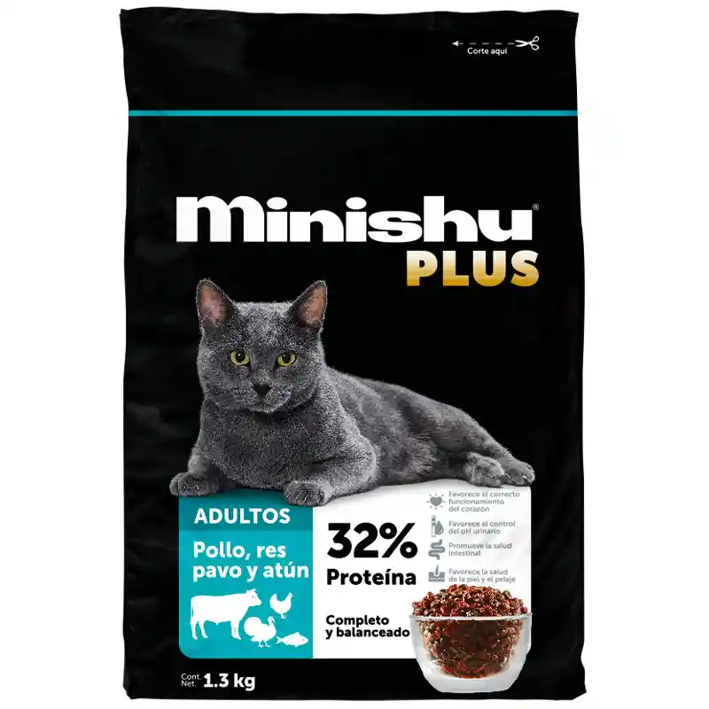 Harina de pollo, harina de pavo, harina de res, harina de atún, harina de cereales de maíz y trigo, subproductos de trigo y maíz, gluten de maíz, pasta de semillas de oleaginosas, grasa animal estabilizada (res y pollo), extracto seco de levadura de cerveza, cultivo de levaduras (Saccharomyces cerevisiae), harina de arroz, derivados lácteos (bovino), concentrados proteicos de ave, harina de algas marinas, extracto de yucca. Vitaminas: A, D3, E, K, B1, B2, B3, B5, B6, B8, B9, B12, cloruro de colina. Minerales: cloruro de sodio, fosfato de calcio, óxido de zinc, óxido manganoso, yodo (EDDI), sulfato de cobre, sulfato ferroso, ácido fosfórico, cloruro de potasio, proteinatos de zinc, cobre, selenio y magnesio. Lactobacillus acidophilus (3.5×104 UFC/g mínimo), Bacillus amyloliquefaciens (1×104 UFC/g mínimo), lisina, metionina, taurina, bióxido de titanio y colorantes: amarillo 5, amarillo 6, rojo 40, café caramelo natural.