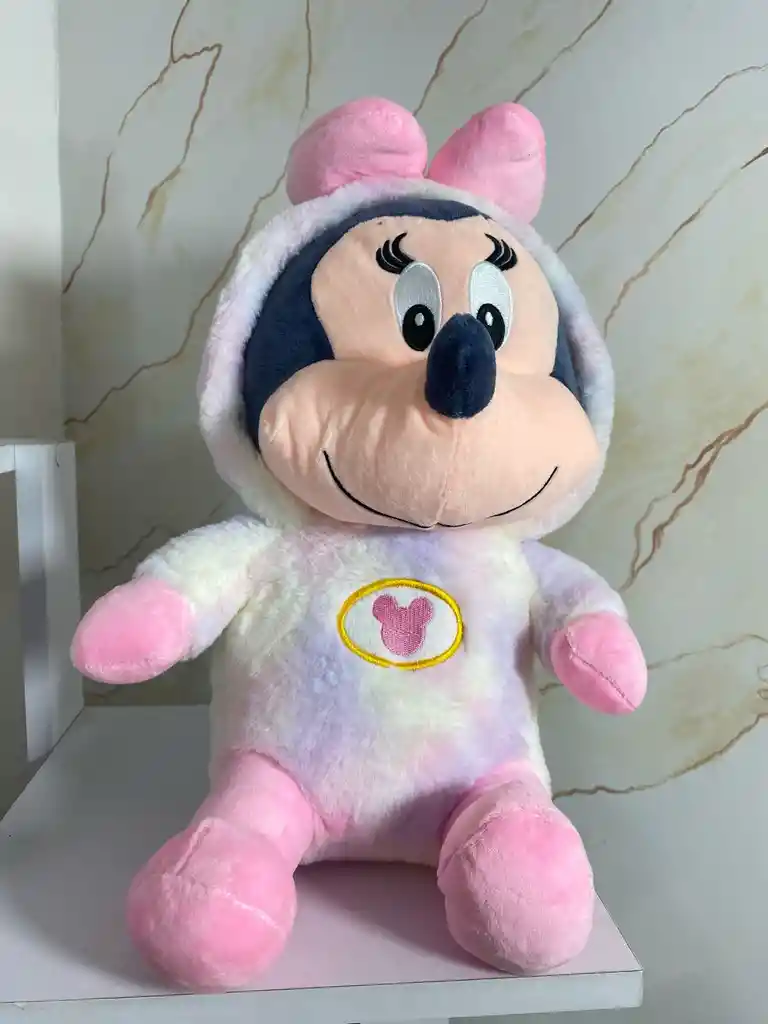 Hermoso peluche de Minnie Mouse en pijama de colores pasteles, empaque y tarjeta de feliz día.