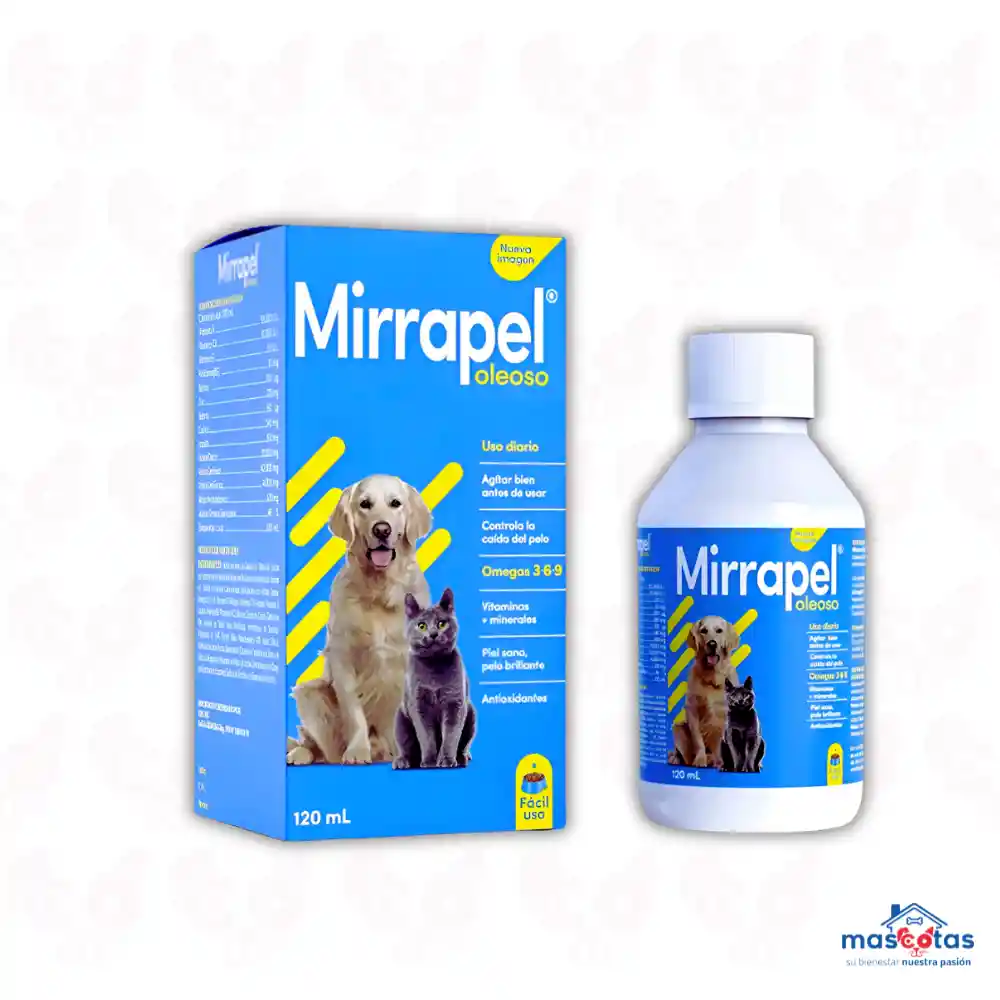Mirrapel Oleoso es un suplemento nutricional líquido para perros y gatos, diseñado para mejorar la salud de la piel y el pelaje. Contiene ácidos grasos esenciales como Omega 3, 6 y 9, además de vitaminas y minerales que ayudan a prevenir problemas dermatológicos, reducir la caída del pelo y promover un pelaje brillante y saludable. Formulación: Mirrapel Oleoso es una emulsión oleosa que combina ácidos grasos esenciales (Omega 3, 6 y 9) con vitaminas (A, D3, E, complejo B) y minerales (zinc, selenio). Beneficios: Piel: Ayuda a mantener la piel hidratada, reduce la sequedad, picazón y reacciones alérgicas. Pelaje: Promueve un pelaje brillante, reduce la caída excesiva y fortalece el crecimiento. Salud general: Contribuye a la salud general de la mascota, mejorando su vitalidad.