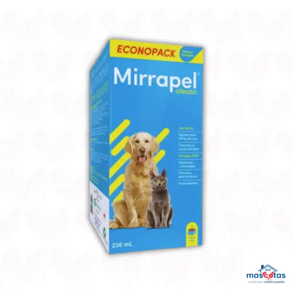 Mirrapel Oleoso es un suplemento nutricional líquido para perros y gatos, diseñado para mejorar la salud de la piel y el pelaje. Contiene ácidos grasos esenciales como Omega 3, 6 y 9, además de vitaminas y minerales que ayudan a prevenir problemas dermatológicos, reducir la caída del pelo y promover un pelaje brillante y saludable. Formulación: Mirrapel Oleoso es una emulsión oleosa que combina ácidos grasos esenciales (Omega 3, 6 y 9) con vitaminas (A, D3, E, complejo B) y minerales (zinc, selenio). Beneficios: Piel: Ayuda a mantener la piel hidratada, reduce la sequedad, picazón y reacciones alérgicas. Pelaje: Promueve un pelaje brillante, reduce la caída excesiva y fortalece el crecimiento. Salud general: Contribuye a la salud general de la mascota, mejorando su vitalidad